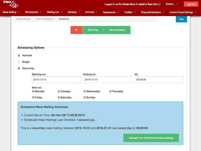 - Schedules: schedule single or recurring mass mailing to be sent in the future